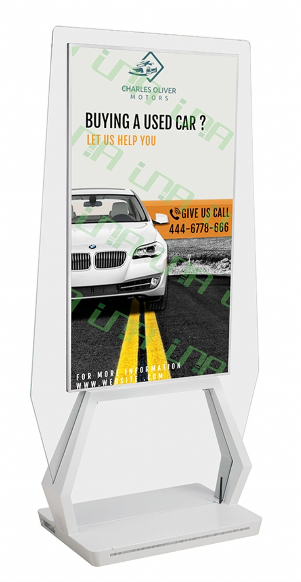 Standing double sided in-glass wallpaper OLED digital signage display. In-glass wallpaper OLED is an innovative display option in which OLED panels are fixed between two layers of tempered glass, one at the front and one at the back. As the surrounding structure is transparent, the display gives the impression that the signage is floating in the air and that the projection is coming directly from the glass pane. With its slim and sophisticated design and dual display, LG OLED signage is an excellent way to partition space while communicating your message using both sides of the panel. The panel is ultra thin and will add an impressive upscale vibe to your ad content.  These are great for retail, banks, business, airports, museum, trade shows, hotel, restaurants or any advertising situation.
